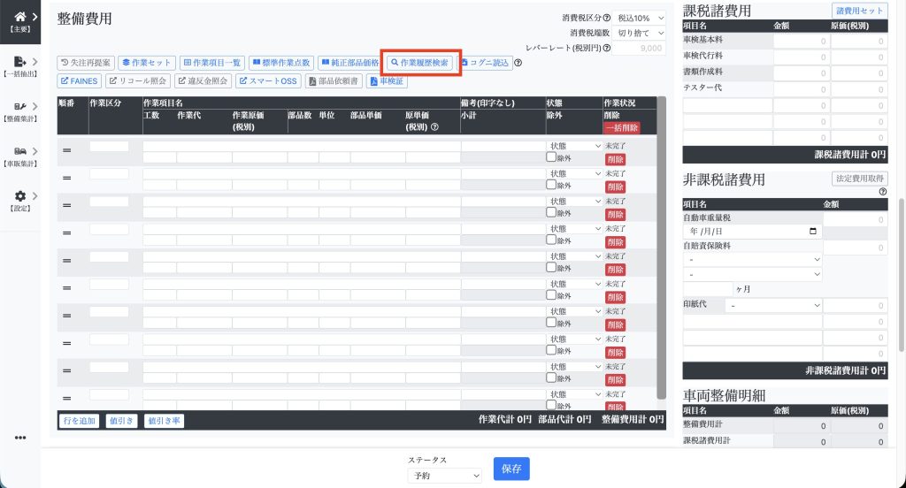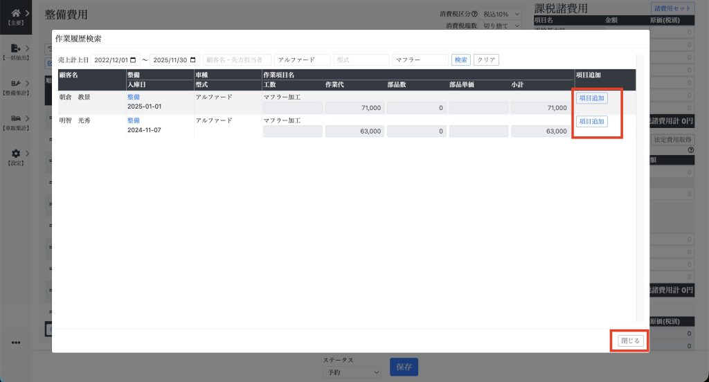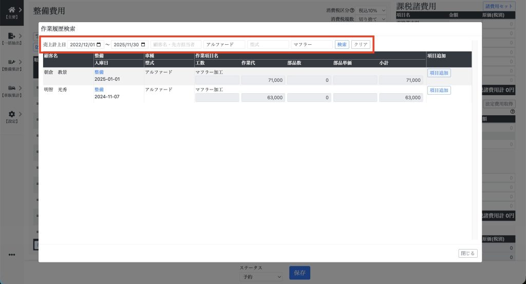 過去の見積から作業項目を検索して見積に追加する 目次機能説明操作説明機能説明 過去の見積から作業項目を検索して見積に追加できます。 操作説明 【主要】⇒【整備一覧】⇒【整備】を開き、整備費用欄の「作業履歴検索」をクリックします。 作業項目などを入力して「検索」をクリックします。車種・型式を絞らず、作業項目だけでも検索可能です。(売上計上日は必須項目で、最長3年間まで指定可能) 「項目追加」をクリックして「閉じる」をクリックします。