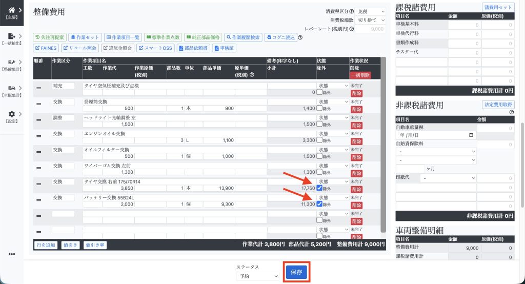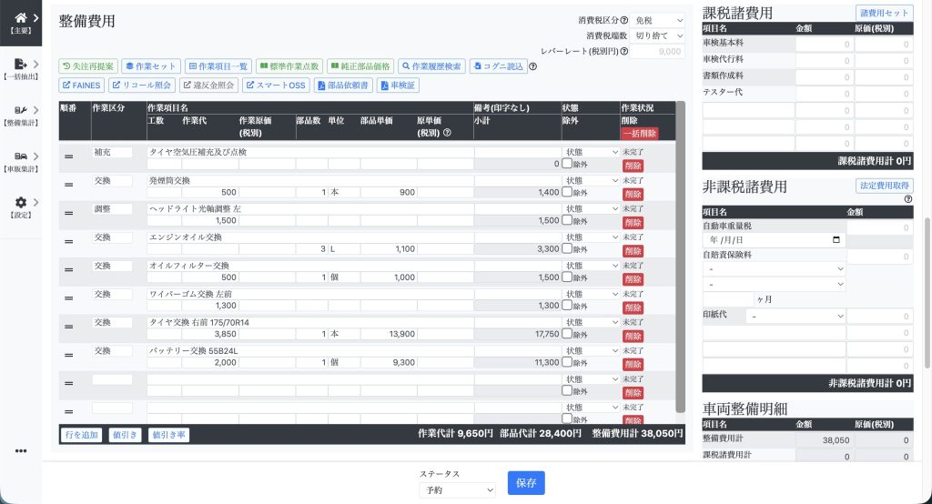 【主要】⇒【整備一覧】⇒【整備】を開き、車検・点検の見積を作成します。