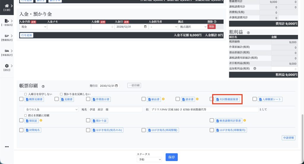 「次回整備提案書」をクリックして印刷します。