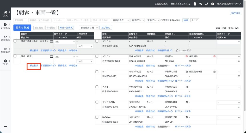 【主要】⇒【顧客・車両一覧】などから、当該顧客の「顧客編集」をクリックします。
