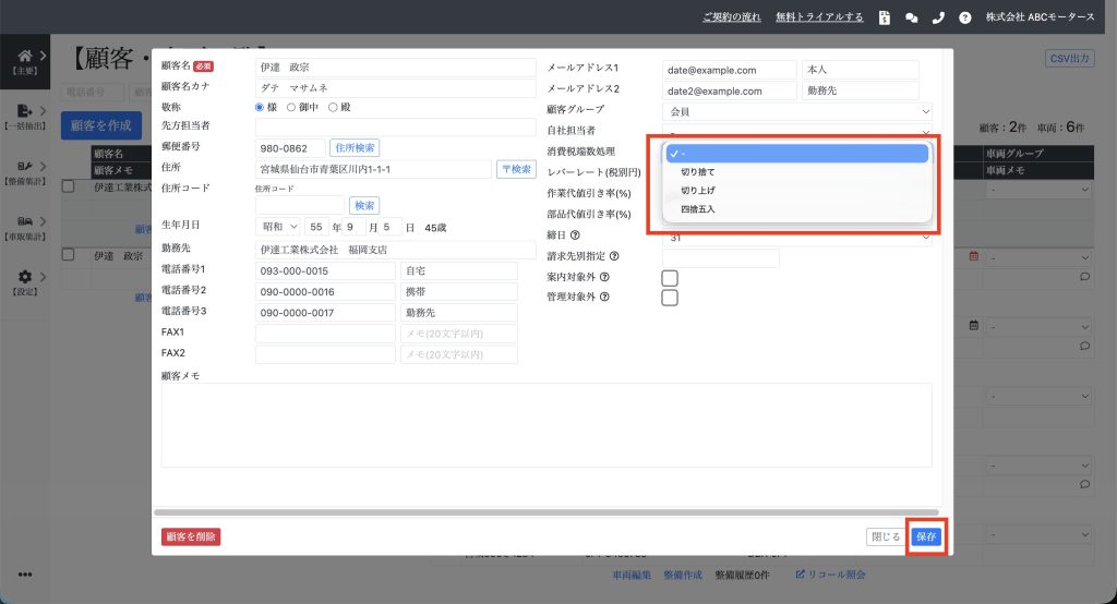 【主要】⇒【整備一覧】⇒【整備】を開き、整備費用欄の「消費税端数」を選択して「保存」をクリックします。