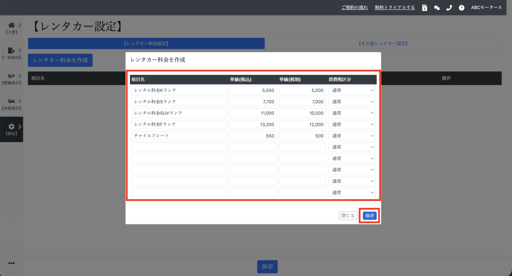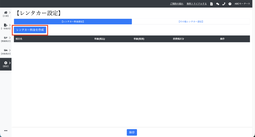 【設定】⇒【レンタカー設定】⇒【レンタカー料金設定】を開き、「レンタカー料金を作成」をクリックします。