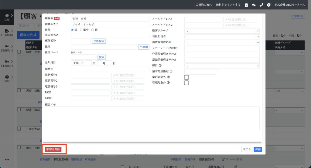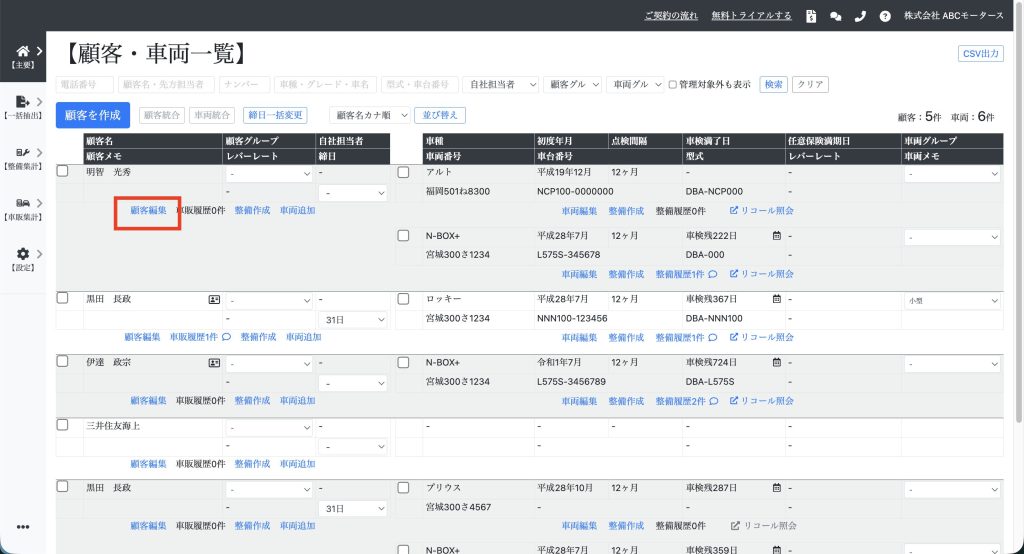【主要】⇒【顧客・車両一覧】などを開き、「顧客編集」をクリックします。