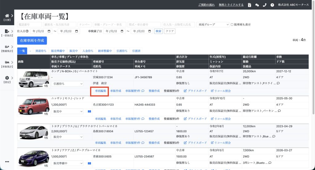 【主要】⇒【在庫車両一覧】を開き、「車両編集」をクリックします。