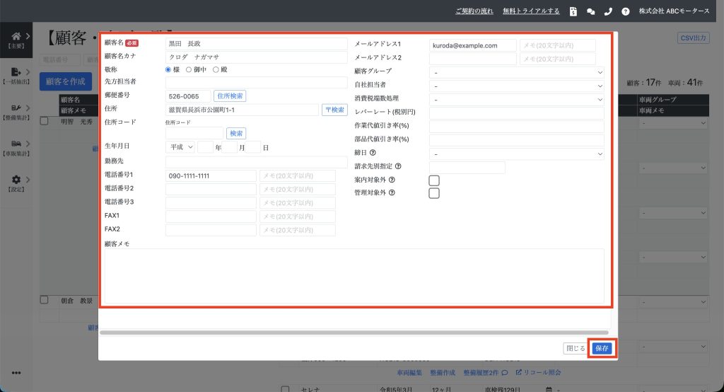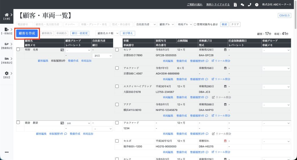 【主要】⇒【顧客・車両一覧】を開き、「顧客を作成」をクリックします。