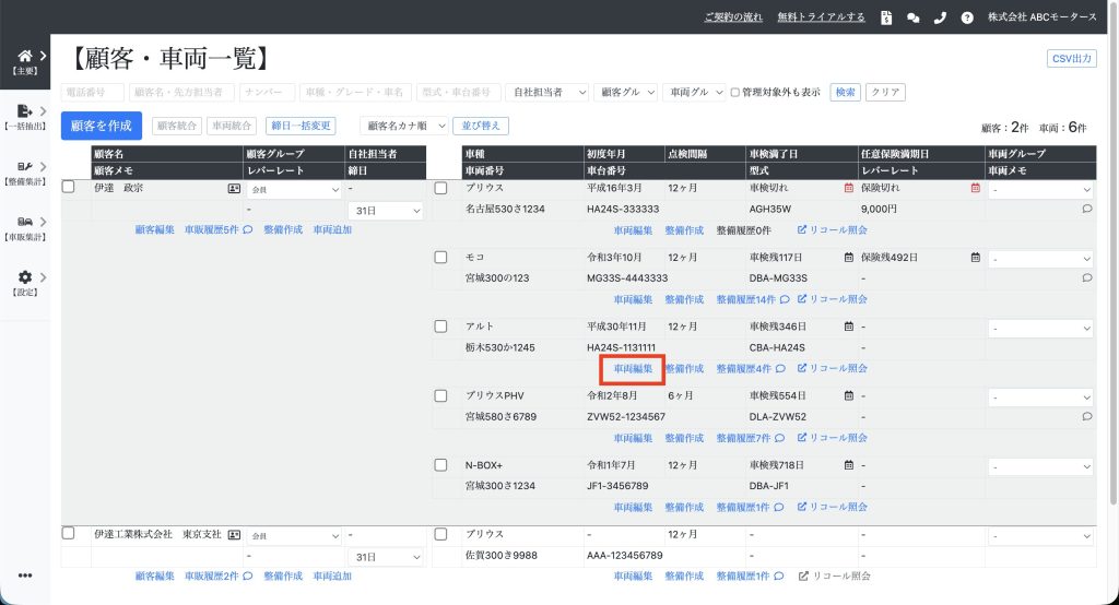 【主要】⇒【顧客・車両一覧】を開き、誤った顧客に紐づけた車両の「車両編集」をクリックします。