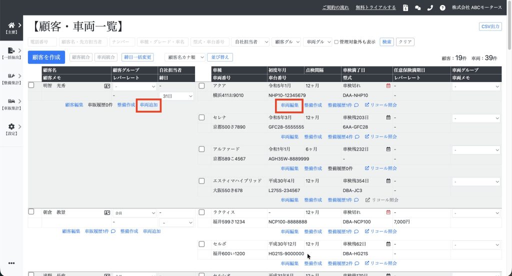 【主要】⇒【顧客・車両一覧】などを開き、「車両追加」または「車両編集」をクリックします。