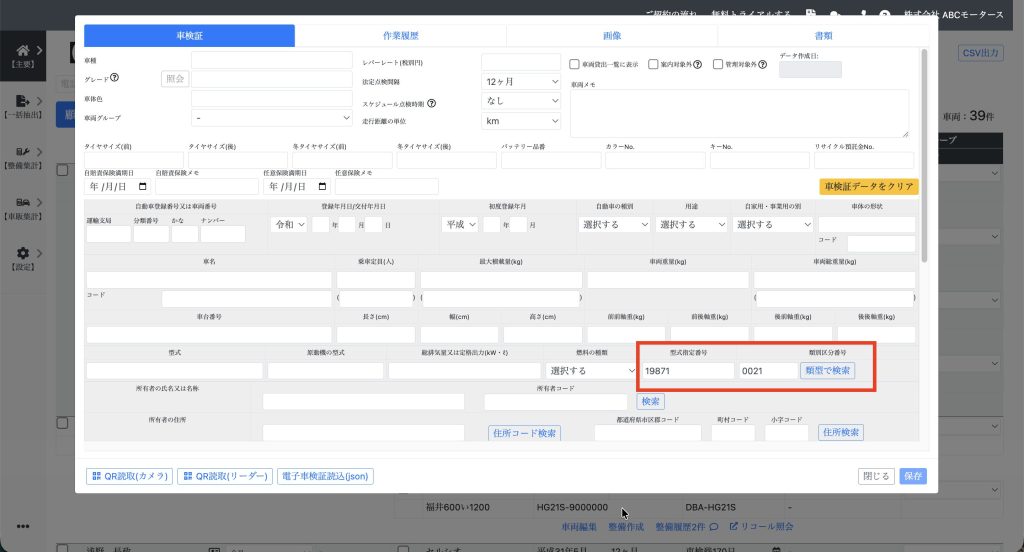 「型式指定番号」と「類別区分番号」を入力して「類型で検索」をクリックすると車検証情報が自動入力されます。