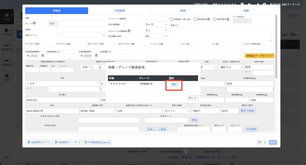 また、搭載データに一致する場合は車種・グレードの検索結果が表示され、「選択」をクリックするとこちらも自動入力されます。