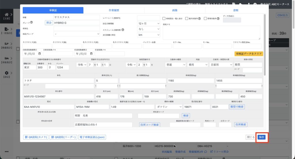 反映された車両情報に誤りがないかをご確認の上、車台番号の後半部分など、残りの項目を入力して「保存」をクリックします。