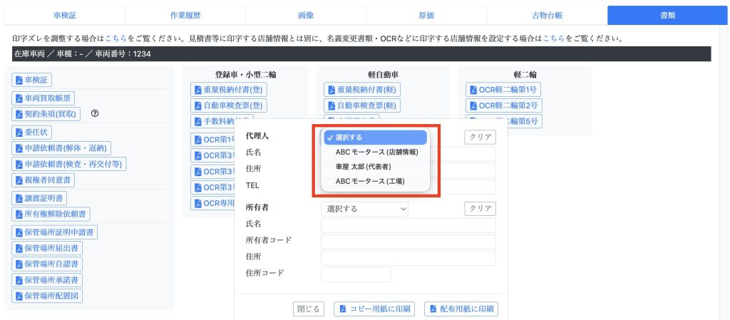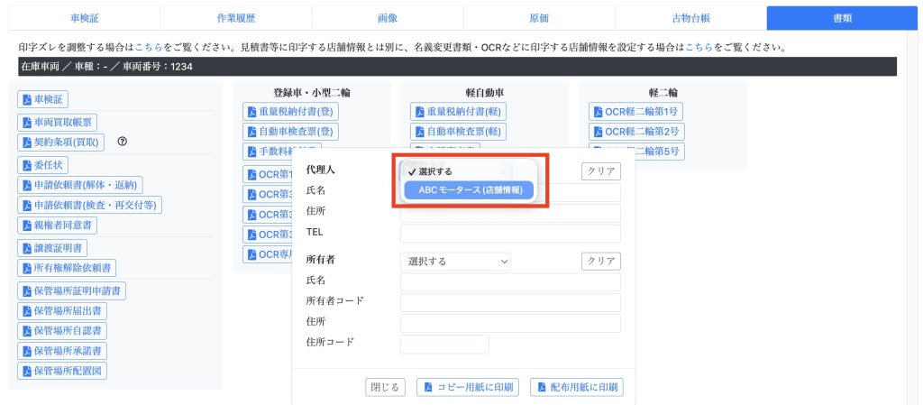 名義変更書類・OCRなどに印字する店舗情報を設定する 目次機能説明操作説明機能説明 見積書等に印字する店舗情報とは別に、名義変更書類・OCRなどに印字する店舗情報を設定できます。 設定前 設定後 操作説明 【設定】⇒【共通設定】⇒【帳票設定】を開き、「書類用の店舗情報」を入力して「保存」をクリックします。「識別名」枠に「工場」「代表者」などと入力すると書類印刷画面で識別しやすくなります。