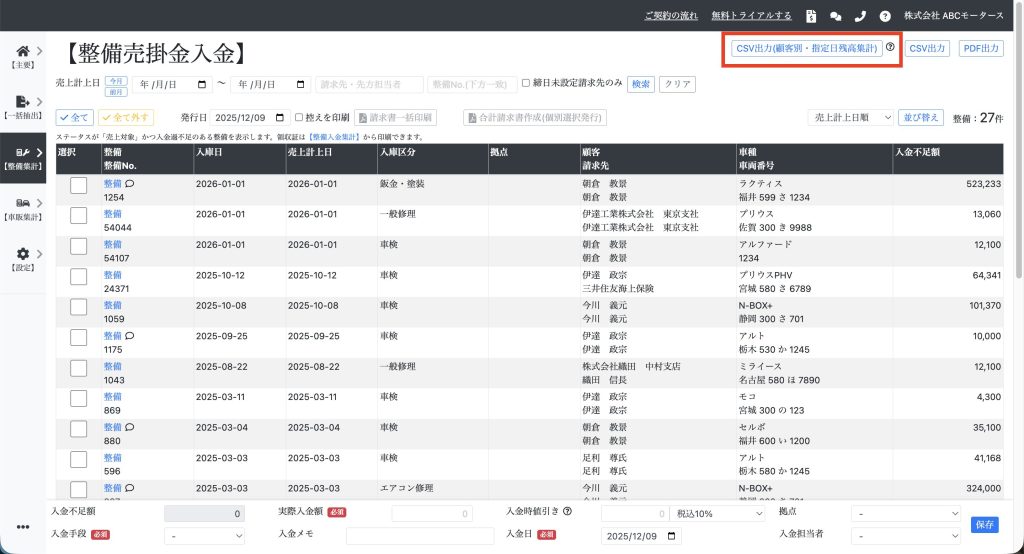 指定日時点での売掛金を集計する場合は、「CSV出力(顧客別・指定日残高集計)」をクリックします。