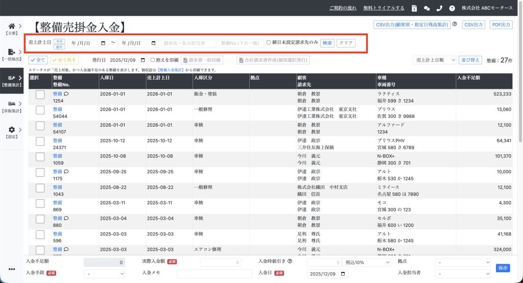 【整備集計】⇒【整備売掛金入金】を開き、売上計上日などを指定して「検索」をクリックします。
