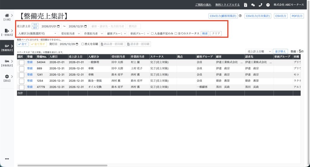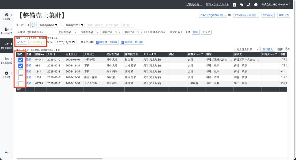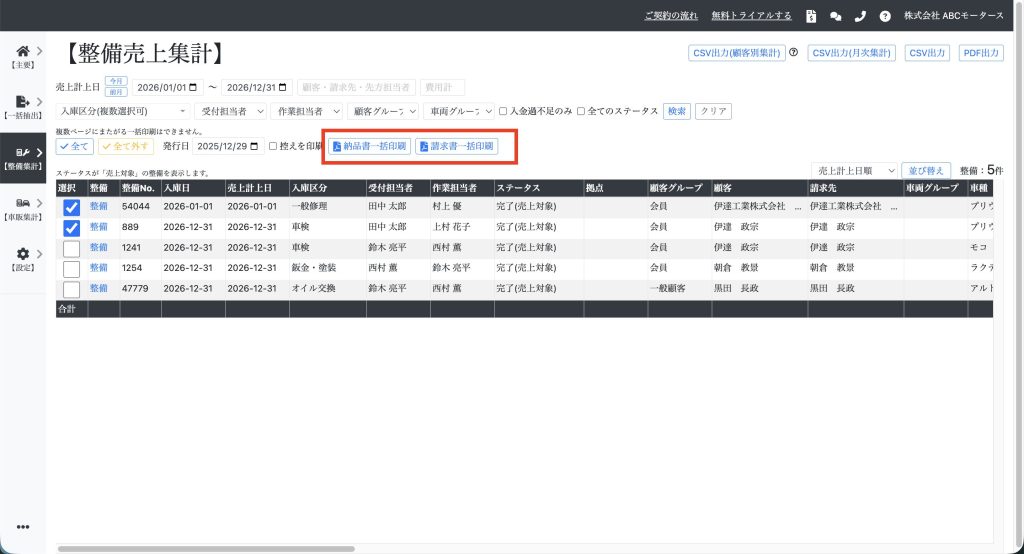 整備の納品書・請求書を一括印刷する 目次機能説明操作説明機能説明 整備の納品書・請求書を一括印刷できます。例えば、月末の経理業務などに使用します。 操作説明 【整備集計】⇒【整備売上集計】を開き、売上計上日などを指定して「検索」をクリックします。 対象の整備を選択します。ページ内のすべての整備を選択する場合は「全て」をクリックします。複数ページにまたがる一括印刷はできません。 『納品書一括印刷』または『請求書一括印刷』をクリックします。