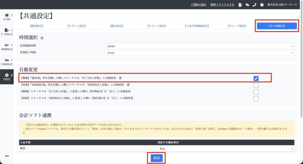 【設定】⇒【共通設定】⇒【その他設定】を開き、「【整備】『請求書』等を印刷した際にステータスを「完了(売上対象)」に自動変更」にチェックを入れて「保存」をクリックします。
