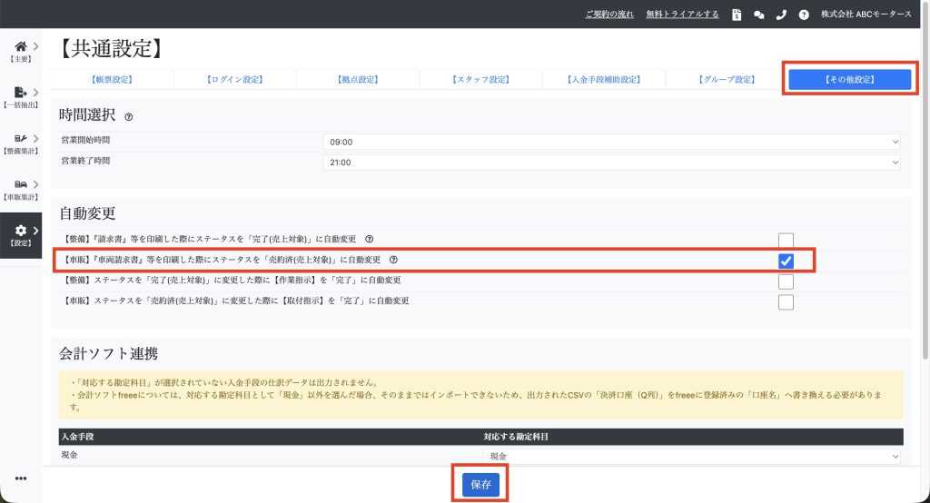 請求書印刷時に車販ステータスを「売上対象」に自動変更する 目次機能説明操作説明機能説明 【車販】で『車両請求書』等を印刷した際に車販ステータスを「売約済(売上対象)」に自動変更できます。 操作説明 【設定】⇒【共通設定】⇒【その他設定】を開き、「【車販】『車両請求書』等を印刷した際にステータスを「売約済(売上対象)」に自動変更」にチェックを入れて「保存」をクリックします。