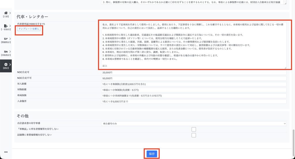 【設定】⇒【共通設定】⇒【帳票設定】を開き、「テンプレートを挿入」をクリックします。内容を編集後、「保存」をクリックします。テンプレートを使用せずにすべて手入力することもできます。