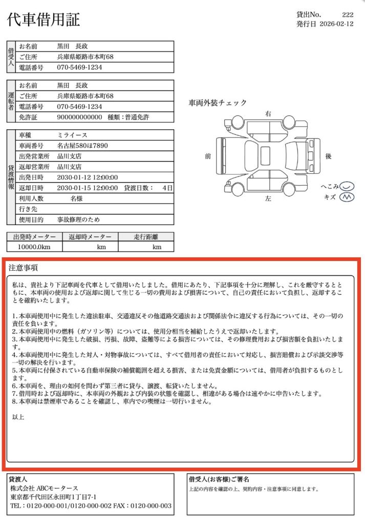 「注意事項」を設定していない場合は、テンプレート文(下記画像の赤枠部分)が印字されます。
