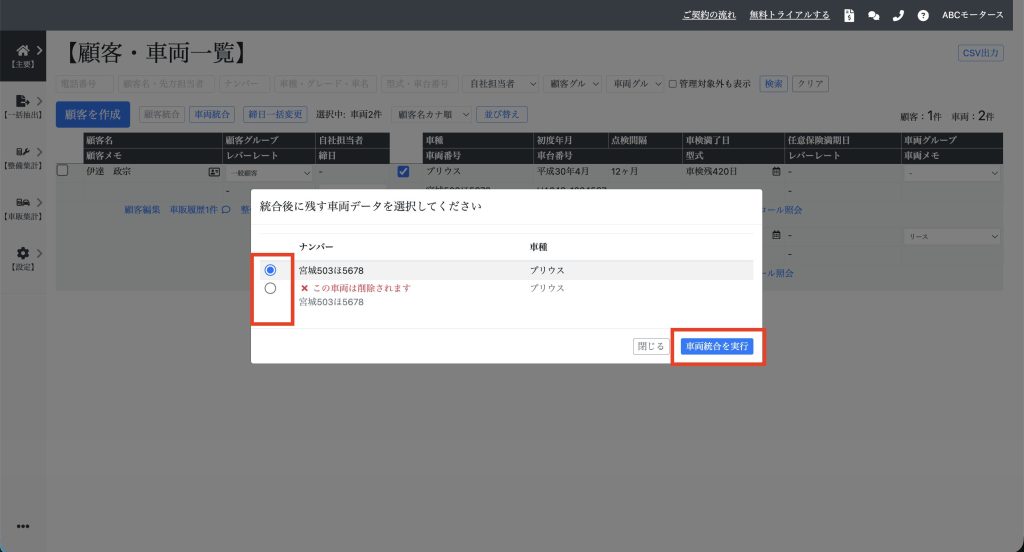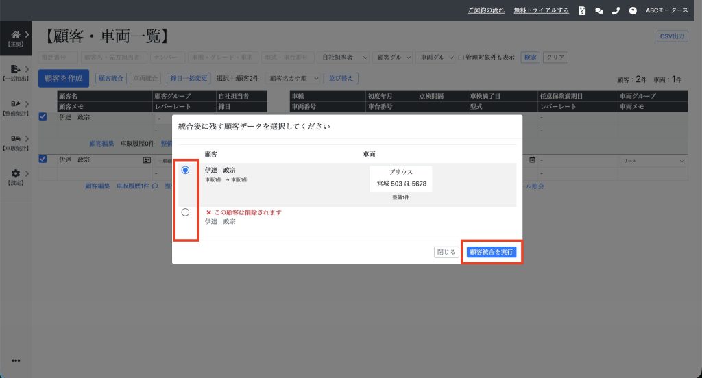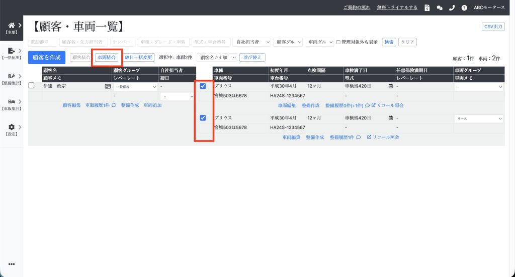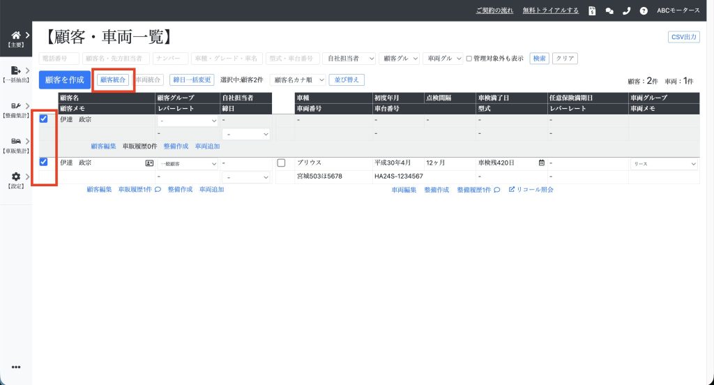 重複する顧客や車両を統合できます。統合すると「整備」「車販」なども統合されます。