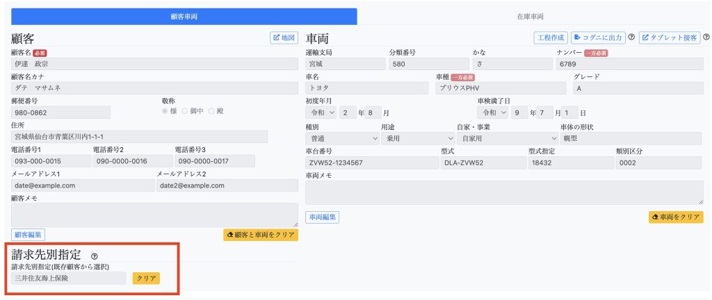 【整備合計請求書】作成(締日発行)で同一顧客が2行に分かれて表示される場合は、【顧客・車両一覧】で同一顧客が複数作成されています(下記画像を参照)。こちらのマニュアルに沿って顧客統合を行なってから、再度、整備合計請求書を作成ください。