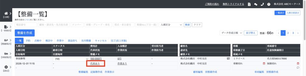 上記で該当の整備データを紐づけると、【整備一覧】で「代車あり」と表示されます。