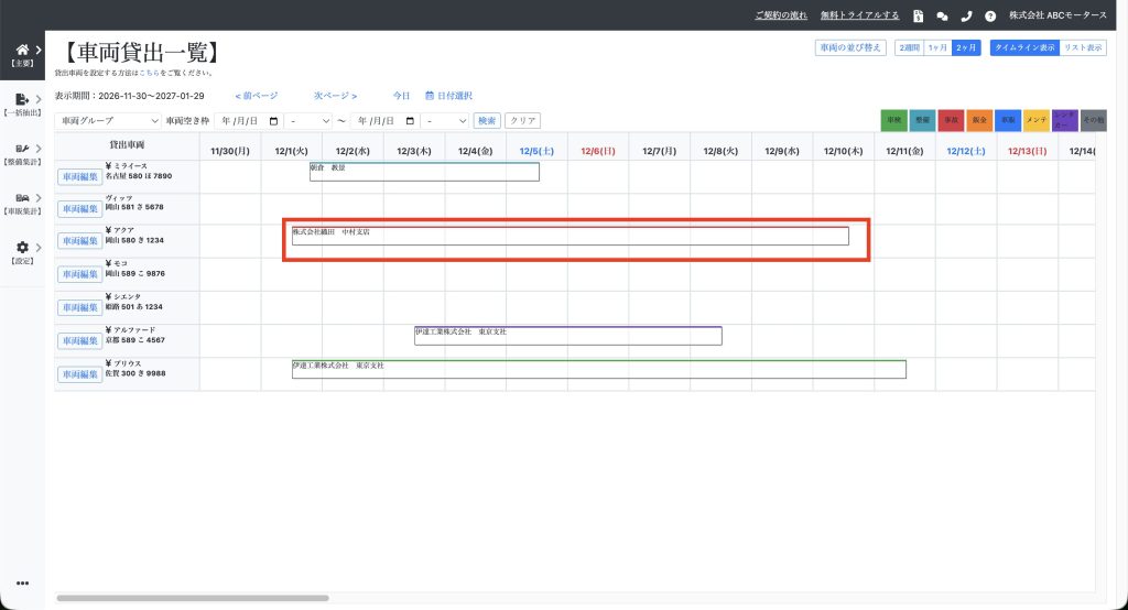 【主要】⇒【車両貸出一覧】を開き、空き枠をクリックします。