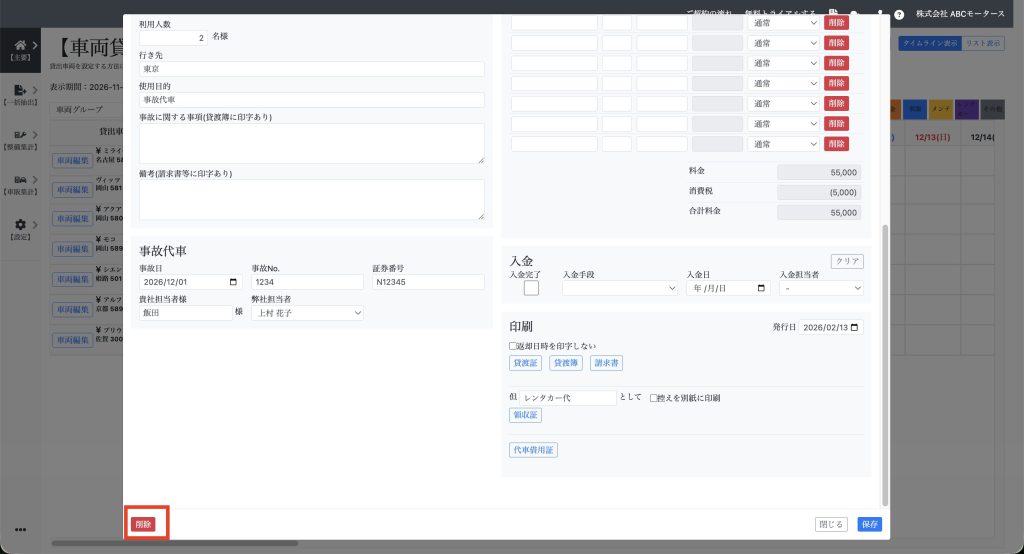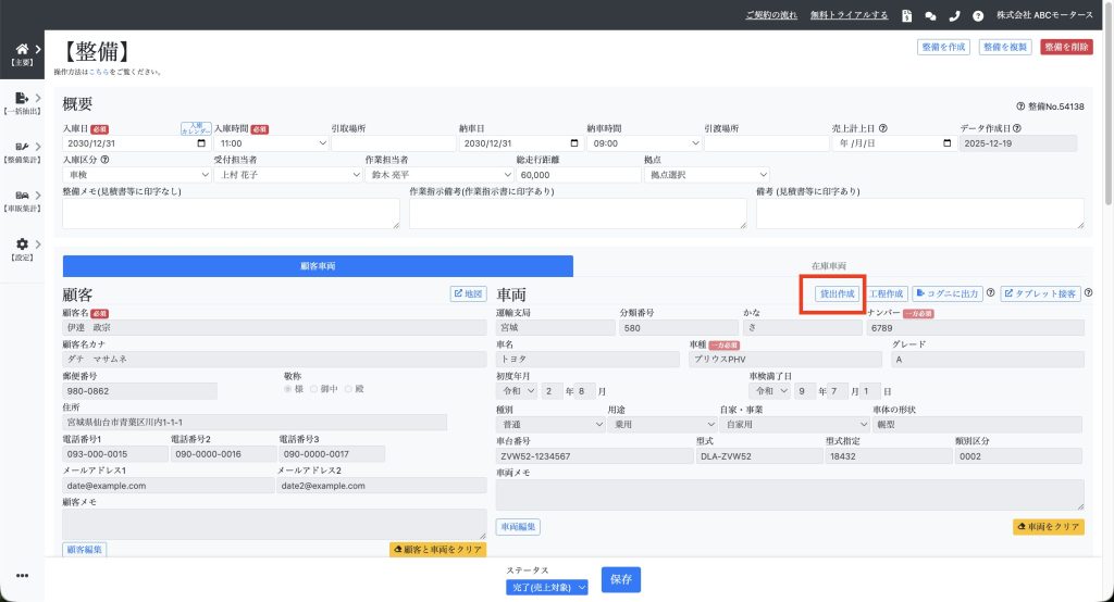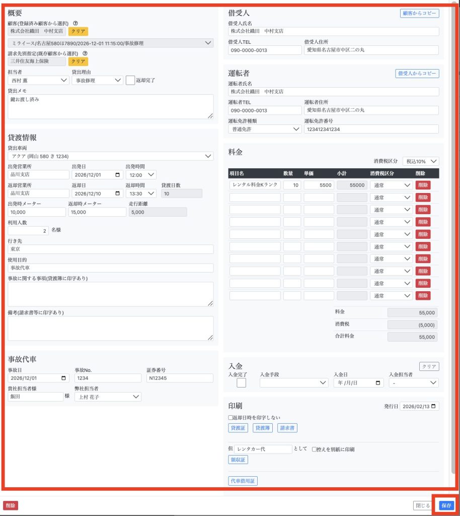 【主要】⇒【整備一覧】⇒【整備】を開き、車両欄の「貸出作成」をクリックします。表示された貸出編集画面の項目を入力して「保存」をクリックします。(【整備】に入力した「顧客」「整備」「請求先別指定」が自動反映されます)
