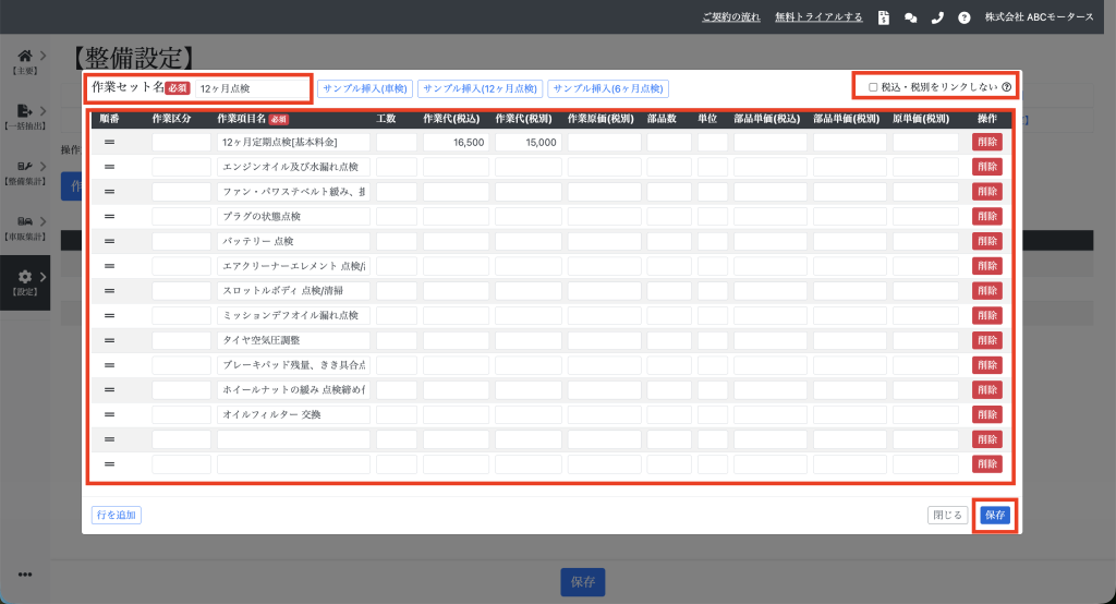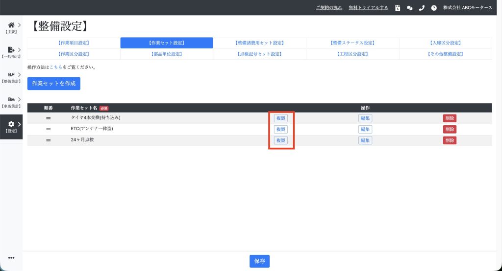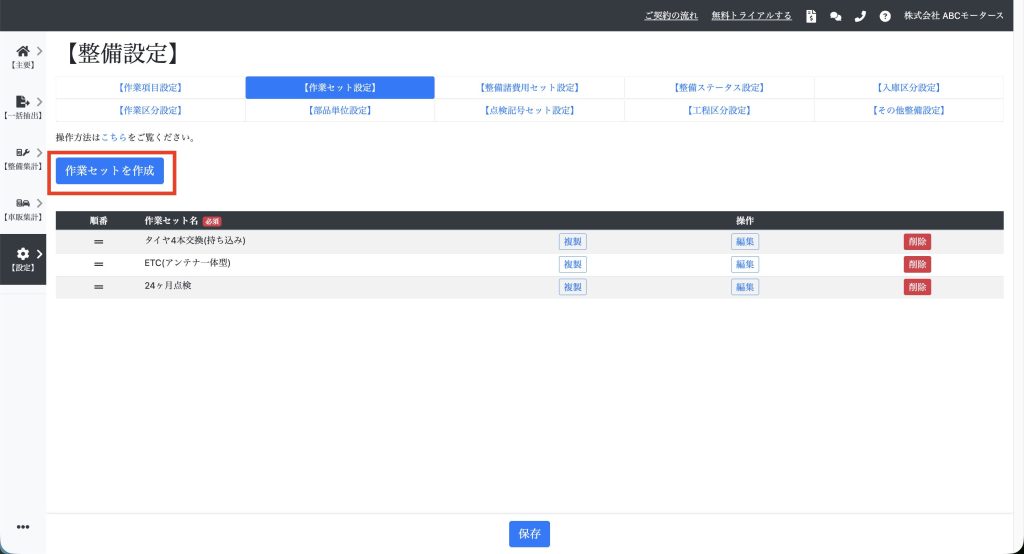 よく使う作業セットを設定する 目次機能説明操作説明機能説明 よく使う作業セットを設定すると、整備データの作成時間を短縮できます。 操作説明 【設定】⇒【整備設定】⇒【作業セット設定】を開き、「作業セットを作成」をクリックします。 項目を入力して「保存」をクリックします。「税込・税別をリンクしない」にチェックを入れると、税込入力時の税別自動計算、税別入力時の税込自動計算を行わなくなります。 既存の作業セットを複製し、他の作業セットも作成できます。