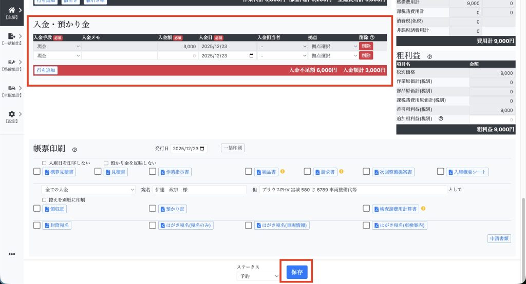 預かり金を差し引いた見積書・請求書を印刷する 〔キーワード:見積書、請求書、預かり金、預り金〕 操作説明 【主要】⇒【整備一覧】⇒【整備】を開き、当該見積の 「整備編集」をクリックします。 入金・預かり金欄に預かり金を入力して「保存」をクリックします。 印刷する帳票をクリックします。
