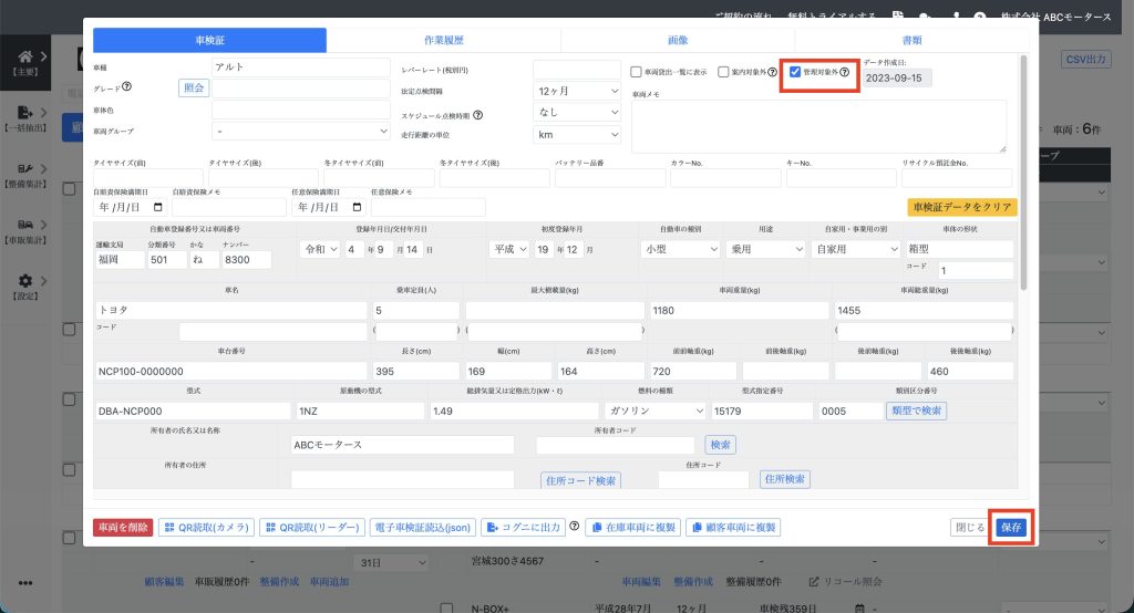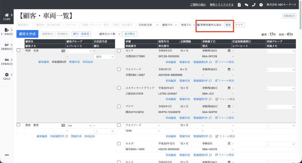 特定の顧客や車両を「管理対象外」に設定することで、下記ページなどに表示されなくなります。