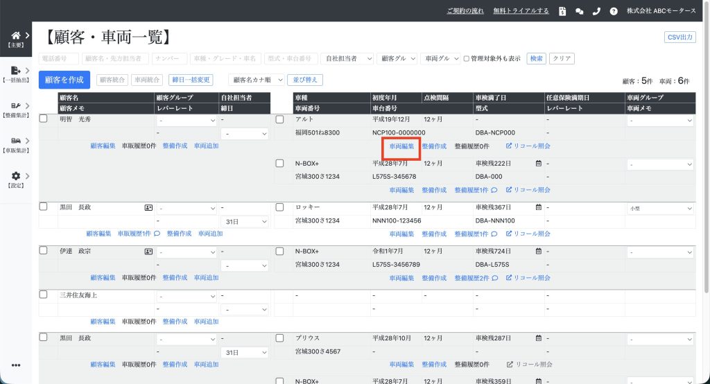 【主要】⇒【顧客・車両一覧】などから、当該車両の「車両編集」をクリックします。