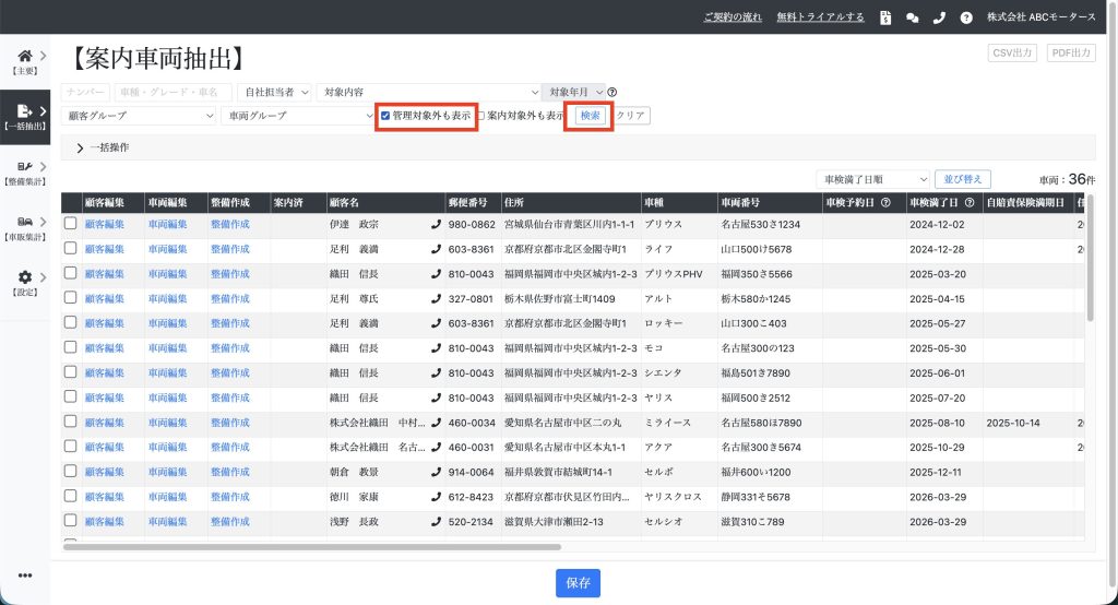 - 車両:【顧客・車両一覧】【案内車両抽出】【入庫促進リスト】および予測変換