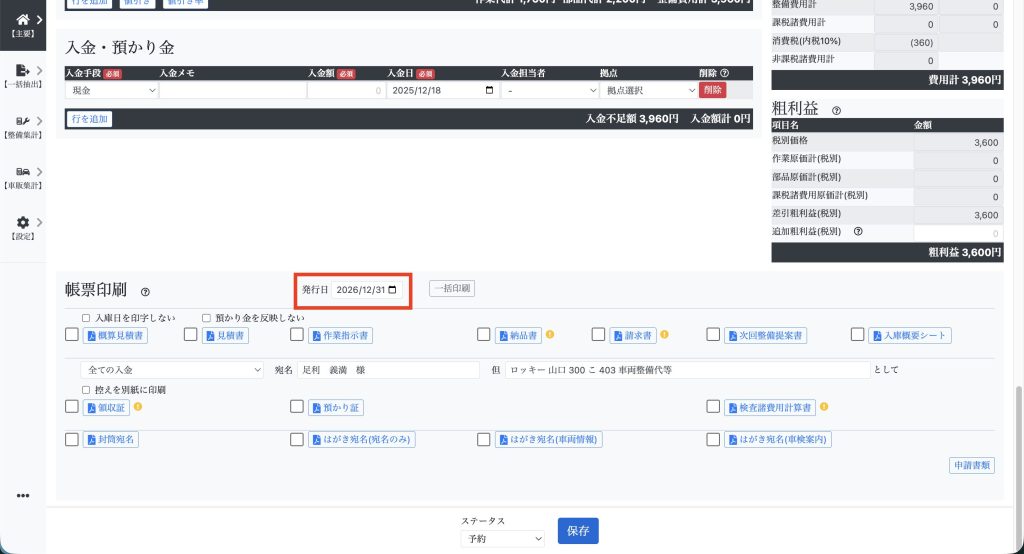 【主要】⇒【整備一覧】⇒【整備】を開き、帳票印刷欄の「発行日」枠をクリックして日付を選択します。(発行日を印字しない場合は、日付を削除します)