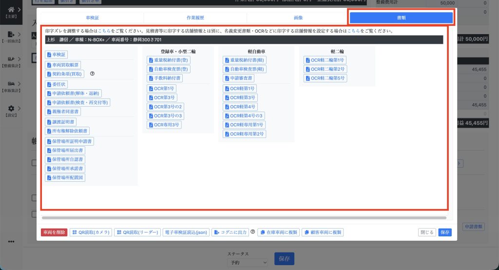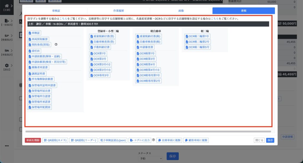【主要】⇒【整備一覧】⇒【整備】または【主要】⇒【車販一覧】⇒【車販】を開き、帳票印刷欄の「申請書類」をクリックします。