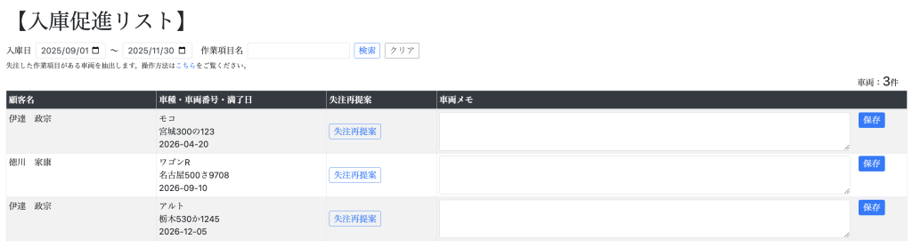 提案して受注に至らなかった作業項目のある車両を一括抽出できます。たとえば、「タイヤ交換」「ブレーキパッド交換」「バッテリー交換」などの作業項目を失注した車両を抽出して電話営業すると売上UPにつながります。