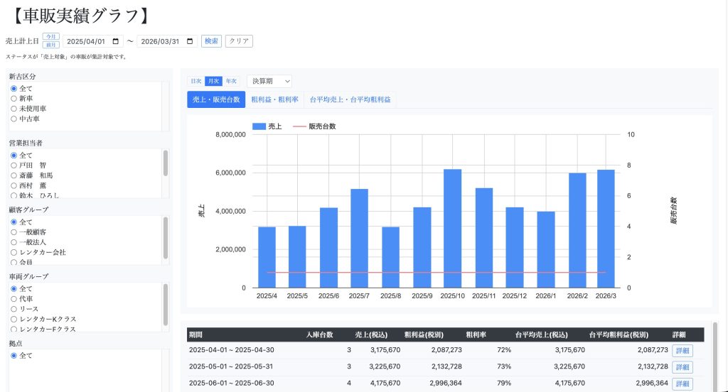 - 「新古区分」「営業担当者」「顧客グループ」「車両グループ」を選択して詳細分析を行えます。