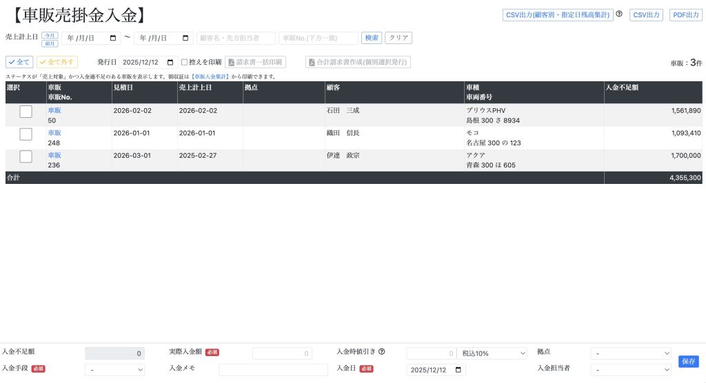 売掛金を一覧して入金処理できるので回収漏れを防げます。[CSV・PDF出力可]