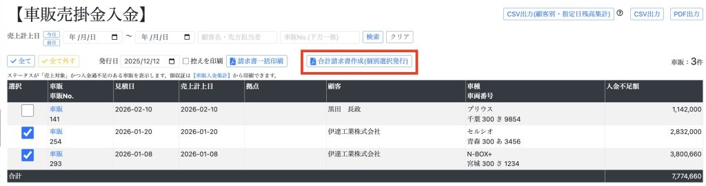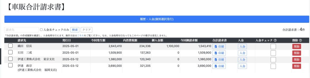 作成した合計請求書に対して入金処理できます。複数の合計請求書に対する一括入金も可能です。