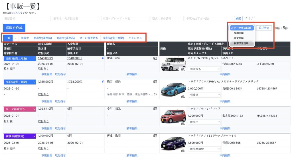 全ての車販データを一覧できます。また、「データ作成日順 | 見積日順 | 注文日順 | 納車予定日順」で並び替えたり、「商談中| ローン審査待ち|売約済」などのステータスで絞り込んだりできます。