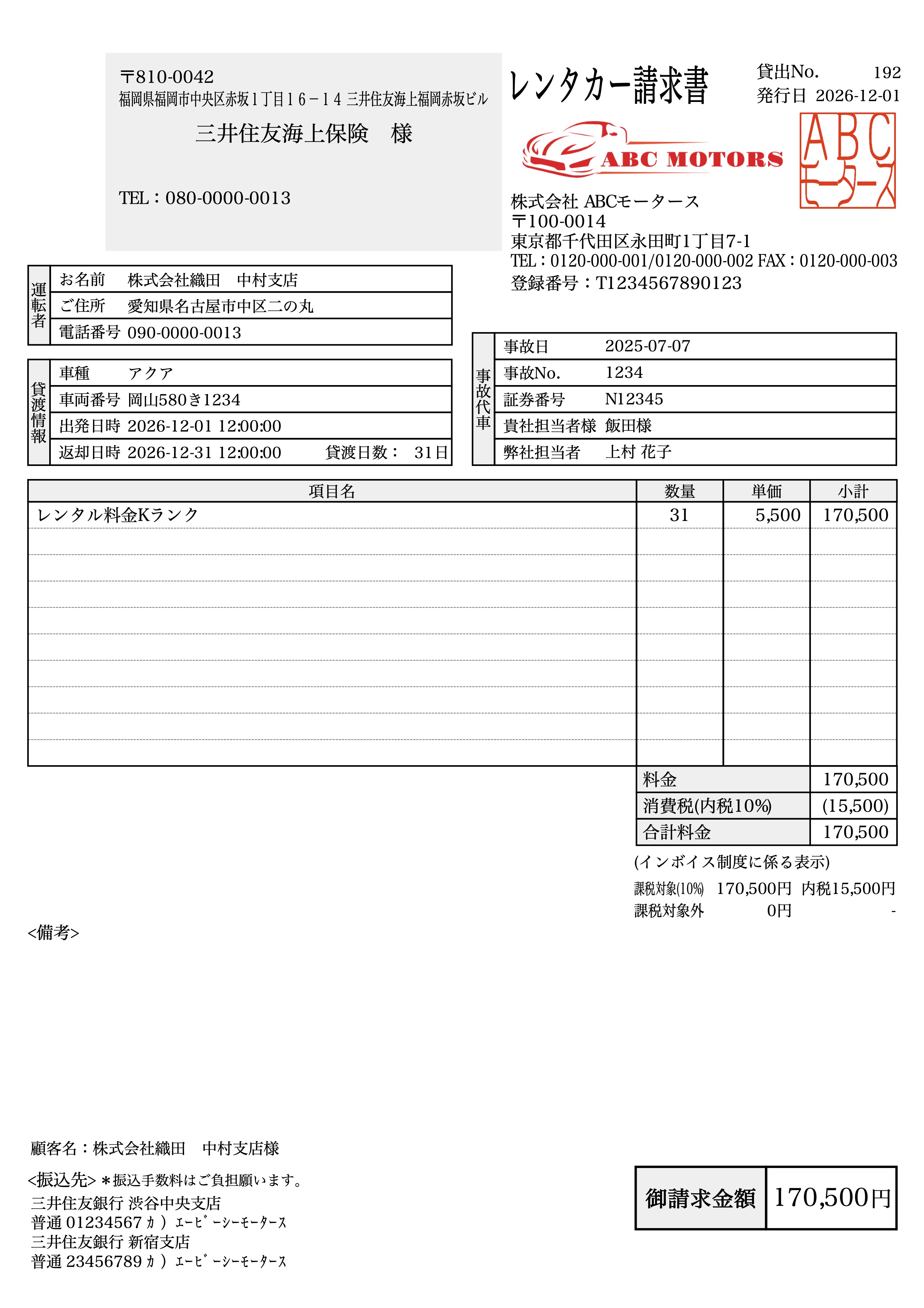 - 保険会社宛の請求書も作成できます。(事故No.・証券番号などを印字)