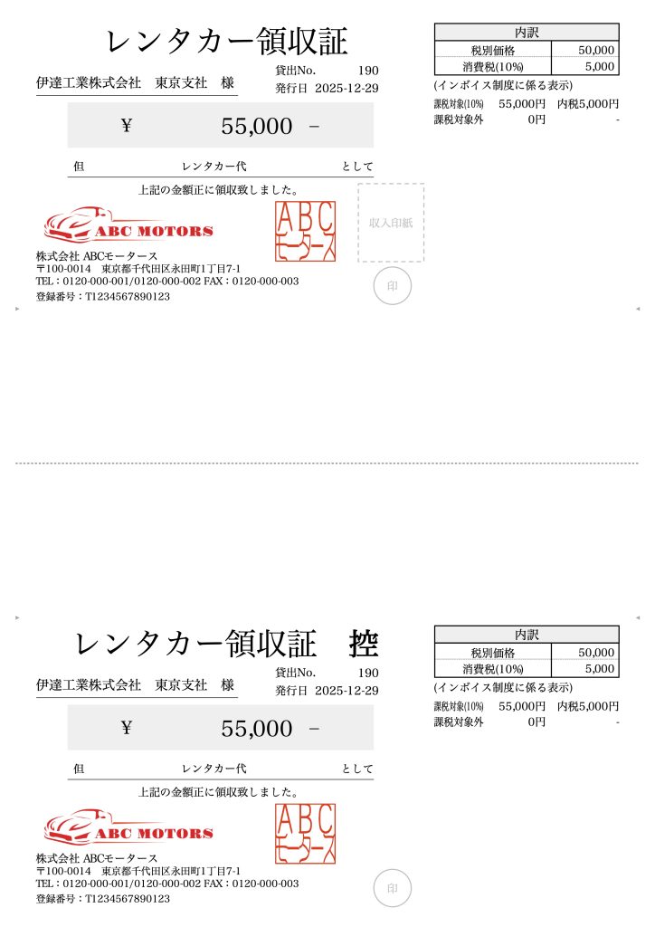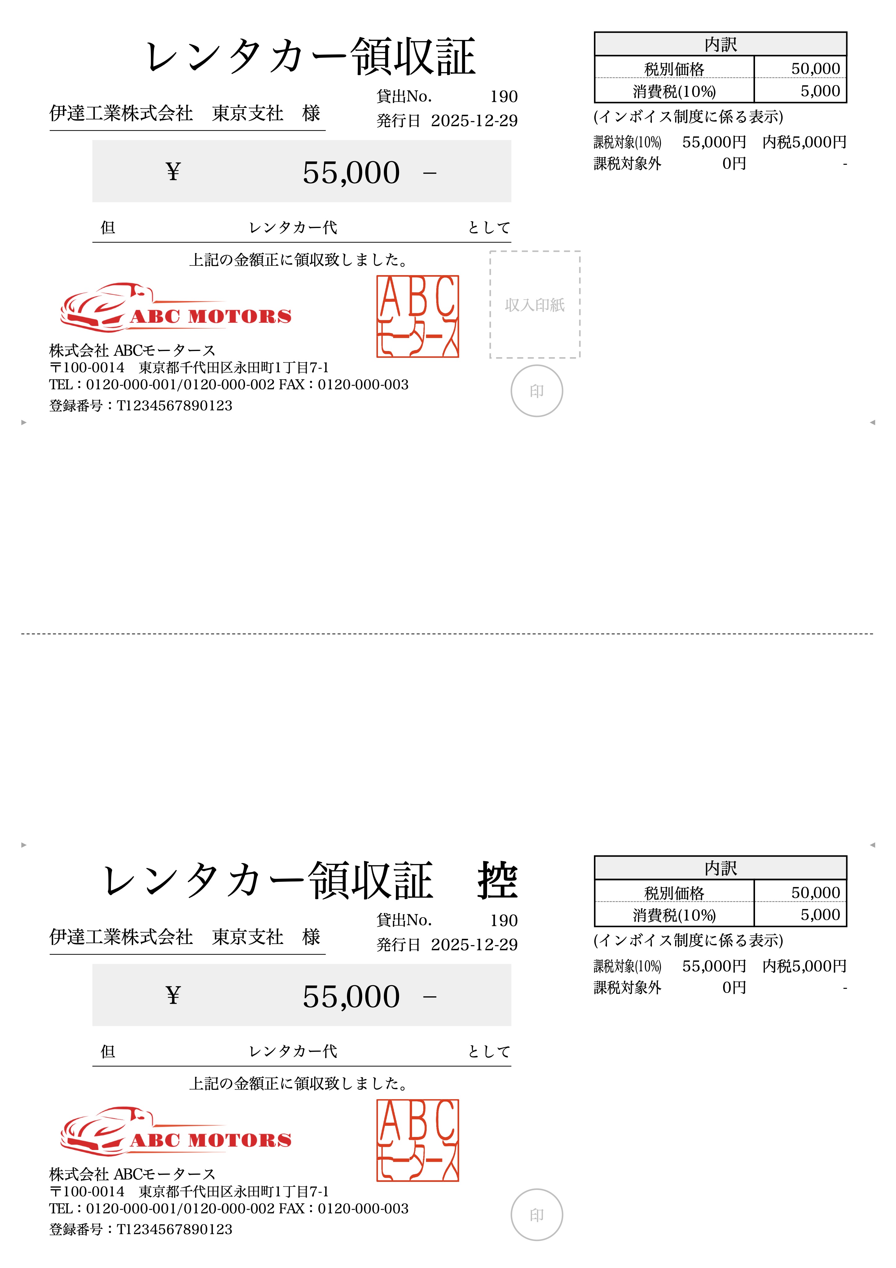 - レンタカー事業で必要となる書類を作成・印刷できます。(請求書・領収証・貸渡証・貸渡簿・貸渡実績報告書・配置車両数一覧表)