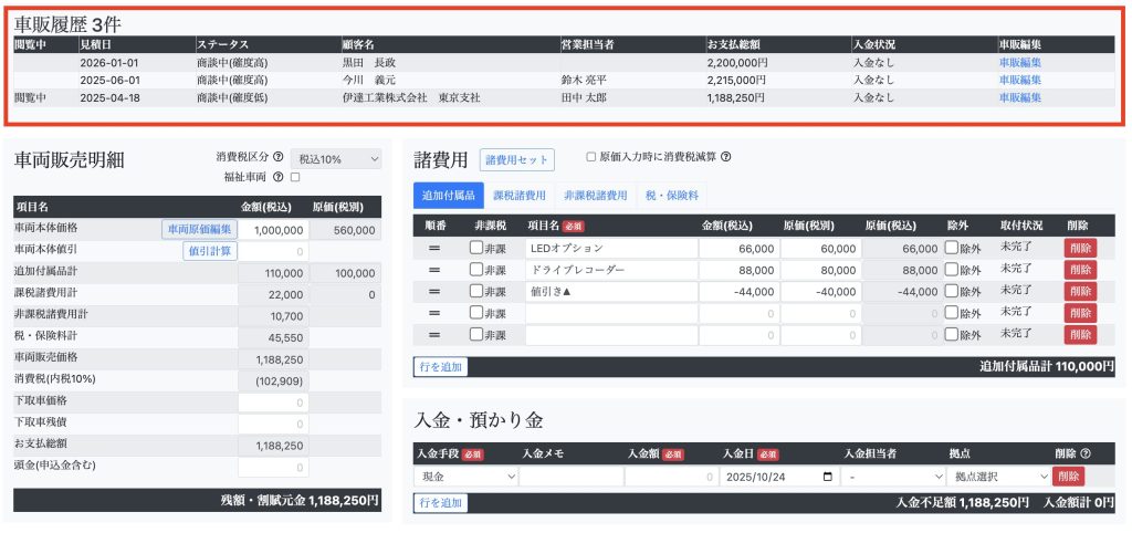 車両原価の入力画面では自由に行を追加できるため、多くのカスタムパーツを取り付けたりする場合でも原価・粗利益を正確に管理できます。