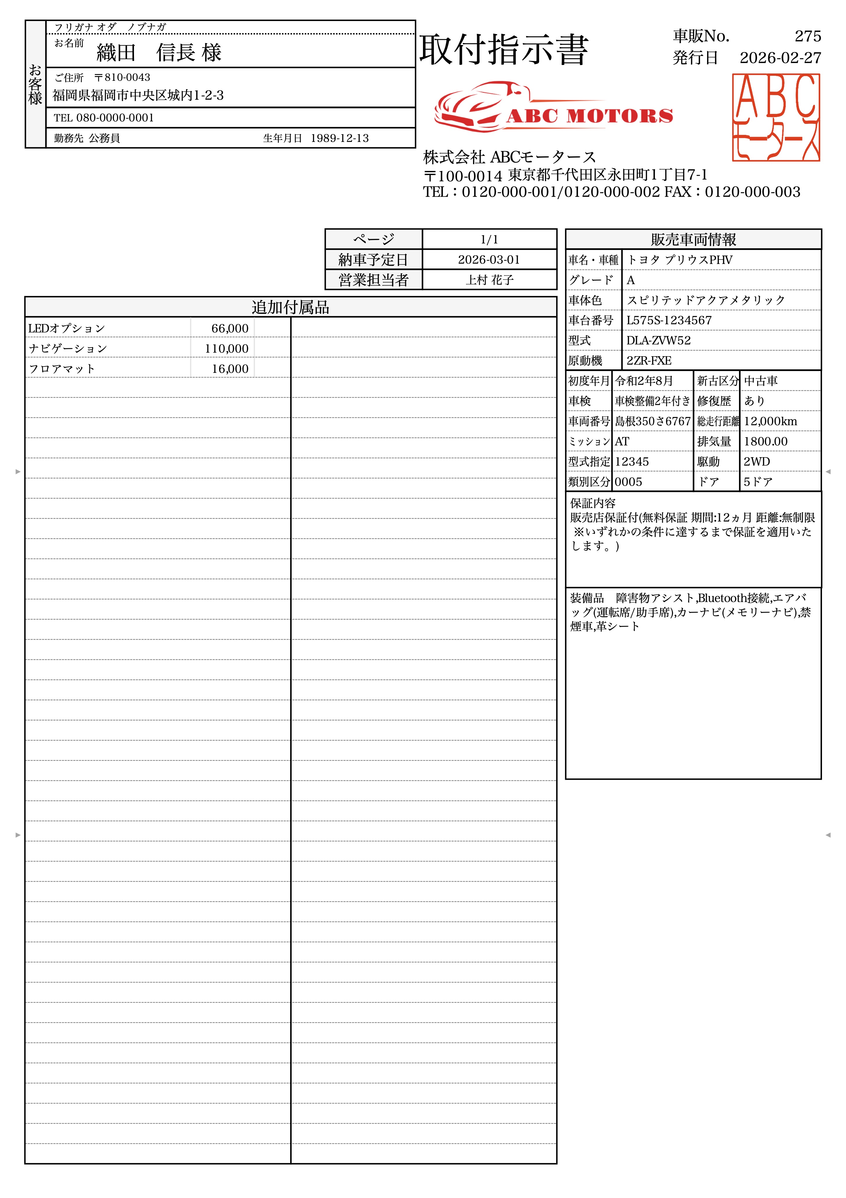 車両見積書・車両注文書(売買契約書)・車両納品書・車両請求書