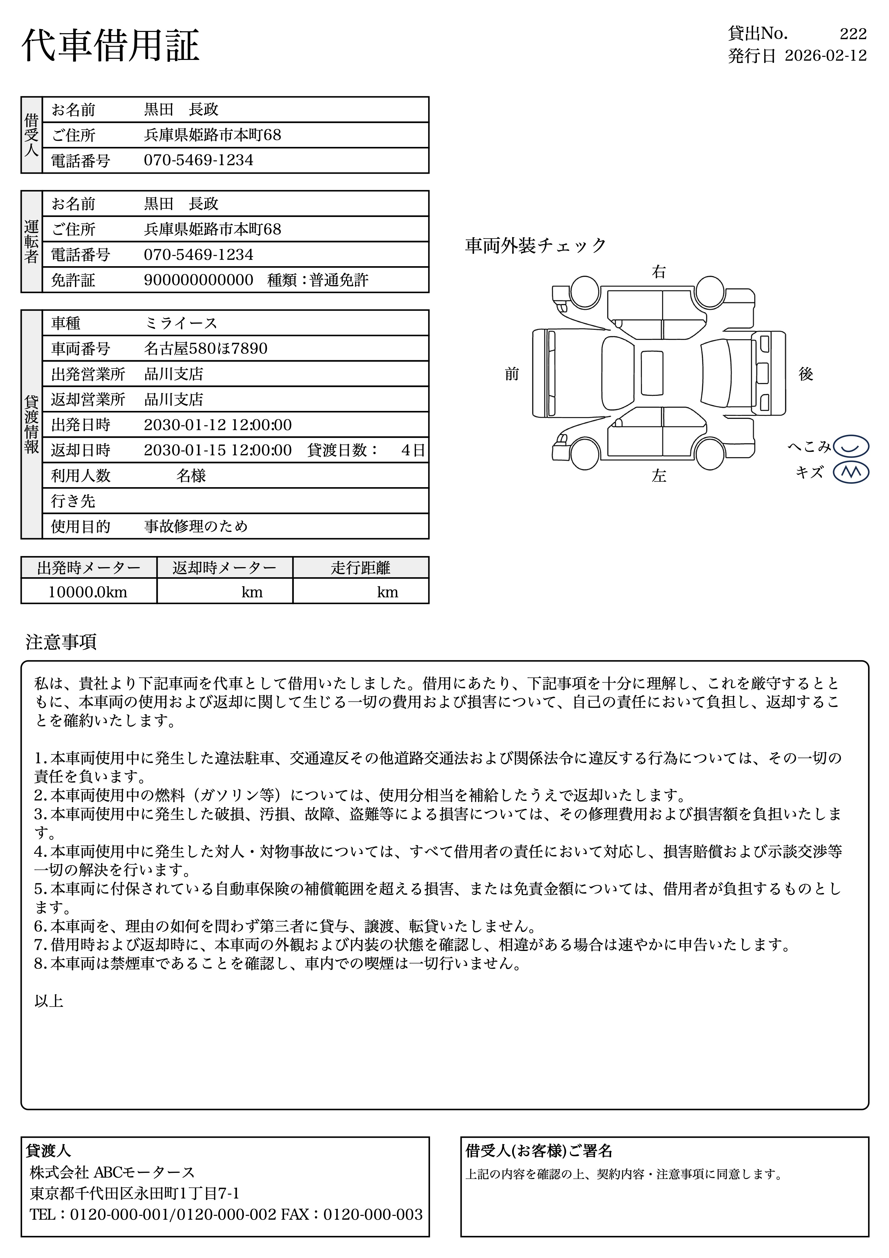 代車・レンタカーの貸出データを作成できます。