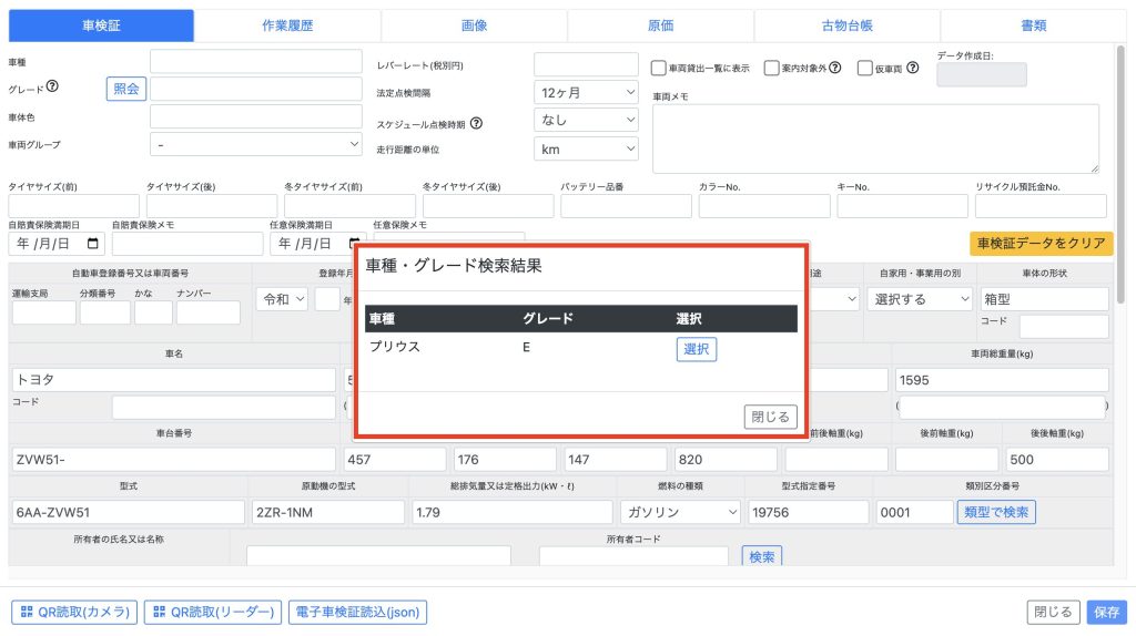 2025.09.29 車種・グレード名を取得可能に 車種・グレード名を手入力せずに取得できるようになると嬉しいです。 というユーザー様からのご要望にお応えします。 車両編集画面で「類型で検索」をクリックした際に、諸元データの入力と同時に車種・グレードの選択画面を表示します。