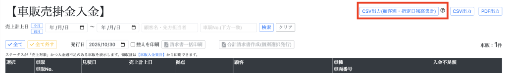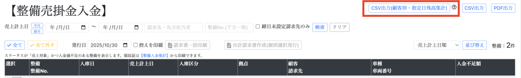 2025.10.28 任意の日付における売掛金残高をCSV出力可能に 現状の仕様では、現時点の売掛金残高しか確認できませんが、任意の日付(例:先月末)における売掛金残高も確認できるようになると嬉しいです。 というユーザー様からのご要望にお応えします。 【整備売掛金入金】【車販売掛金入金】にCSV出力機能を追加します。