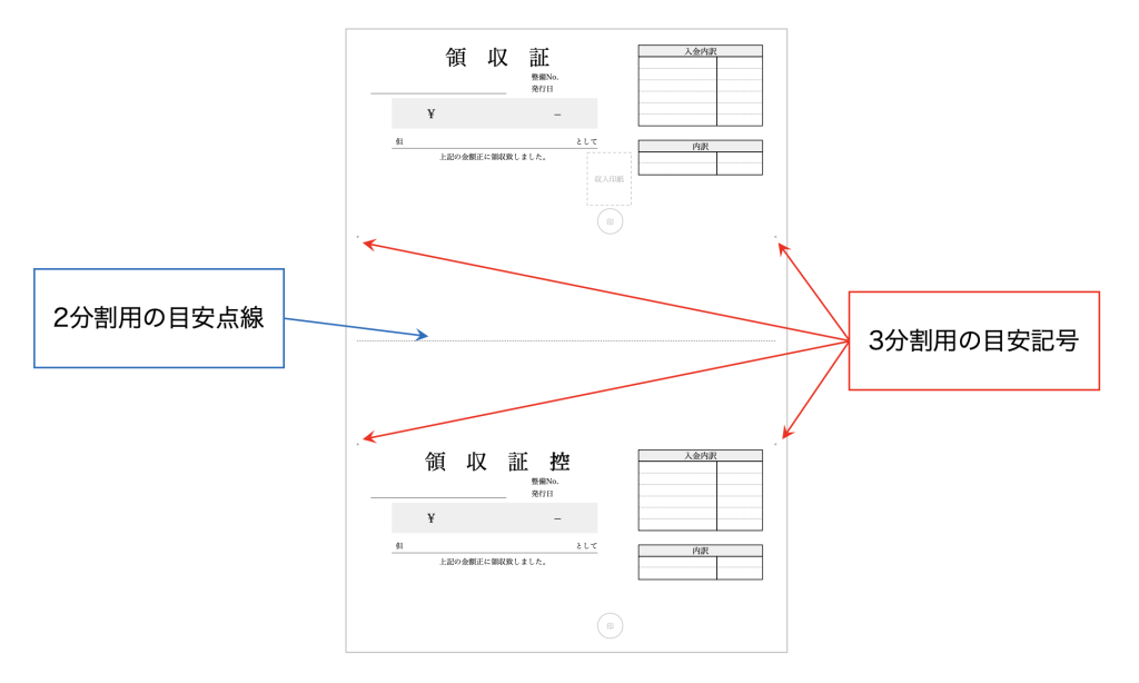 領収証等を2分割にも3分割にもできるように、目安となる点線や記号を印刷します。