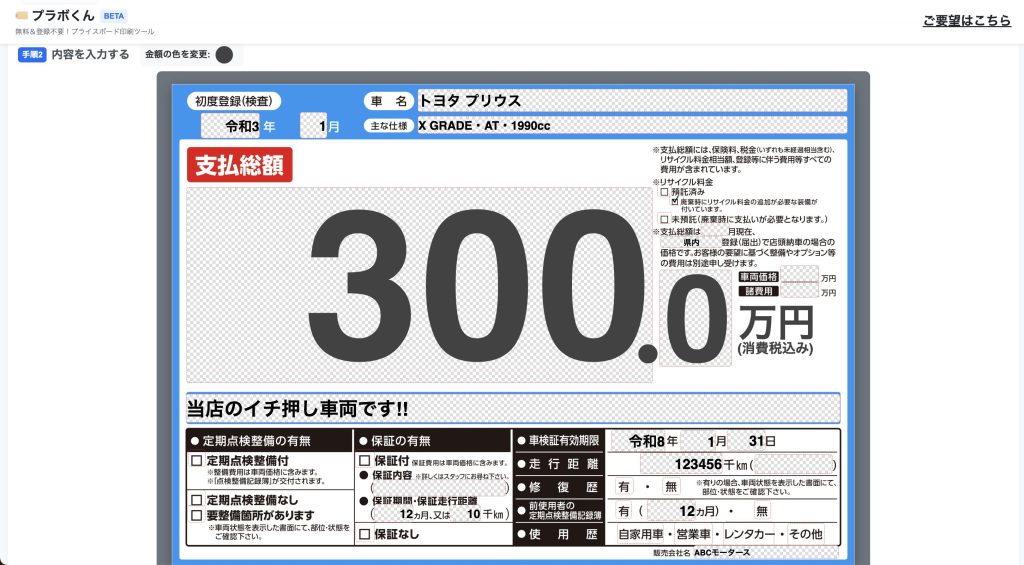 【在庫車両一覧】から「プライスボード」をクリックすると、「プラボくん」に以下の情報が連携され、そのままプライスボードを印刷できるようにします。