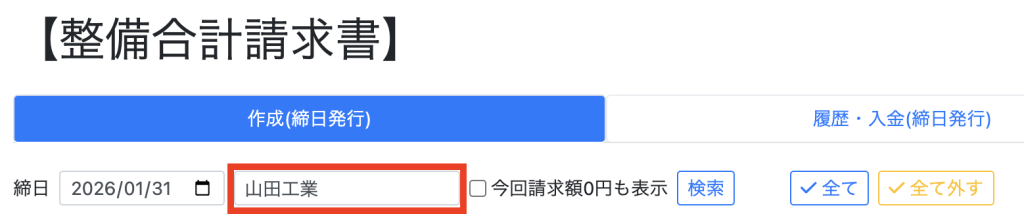 2026.01.08 【整備合計請求書】「作成(締日発行)」タブを「請求先名」で検索可能に 【整備合計請求書】「作成(締日発行)」タブを「請求先名」で検索できるようになると嬉しいです。 というユーザー様からのご要望にお応えします。