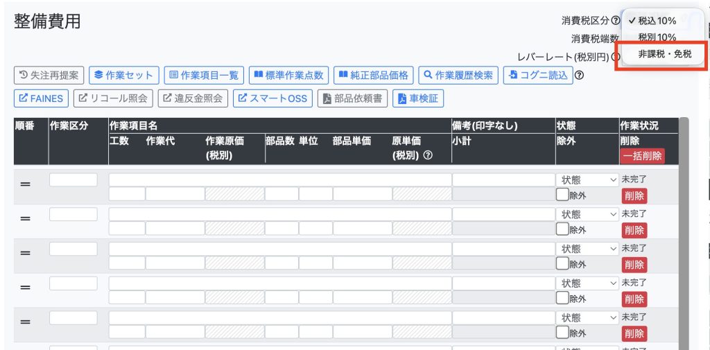 現状、【整備】においては、消費税が課されない場合の消費税区分として「免税」のみが印字可能となっていますが、「非課税」についても印字できるようになると嬉しいです。